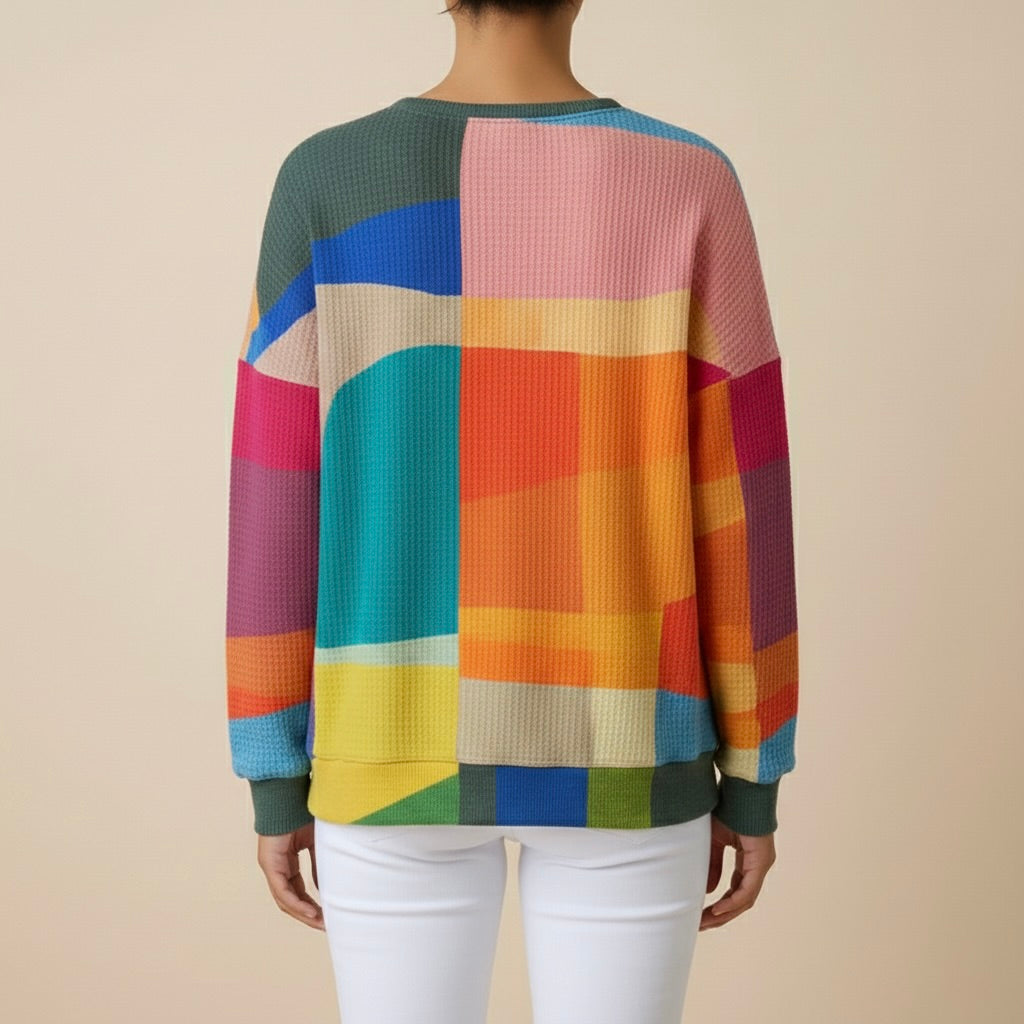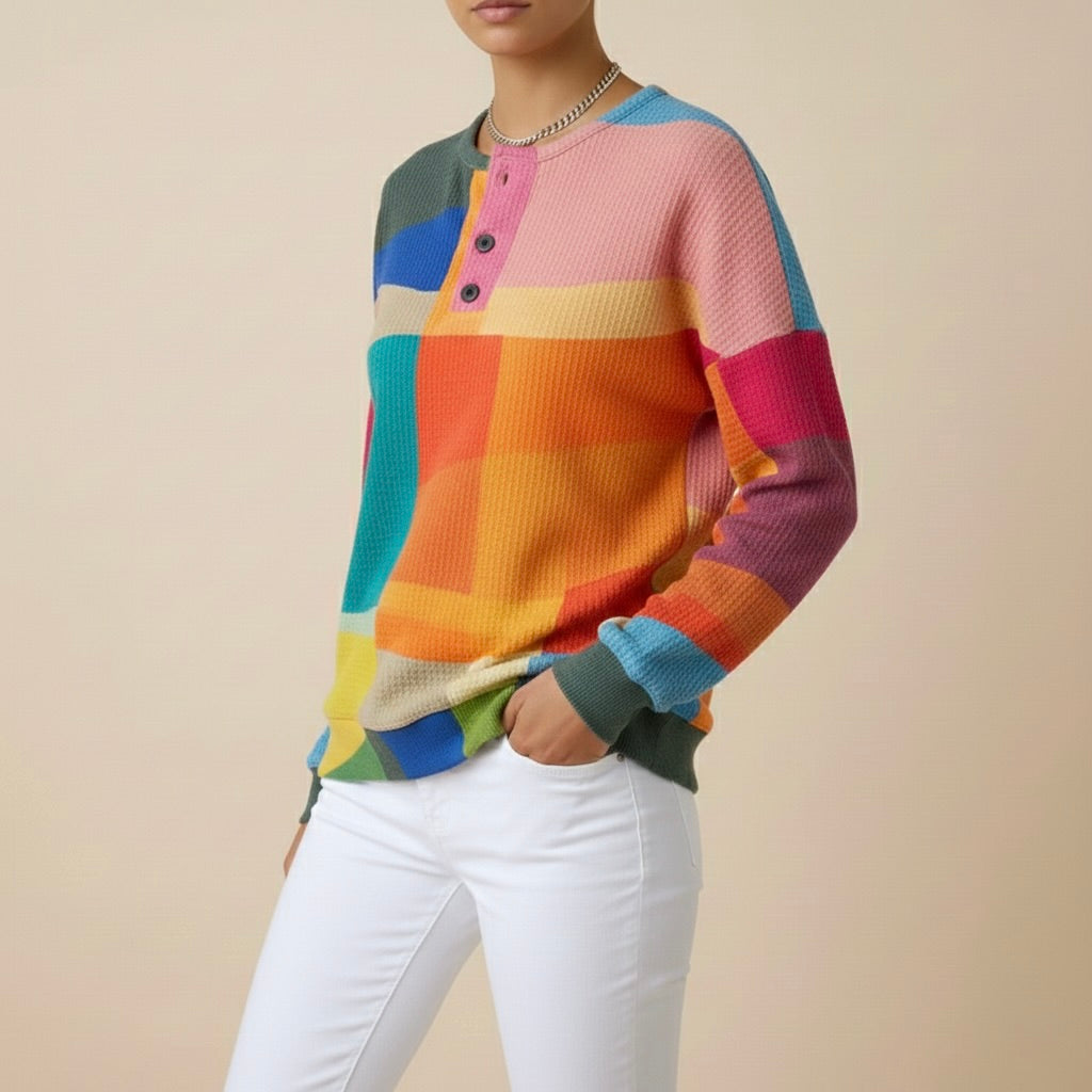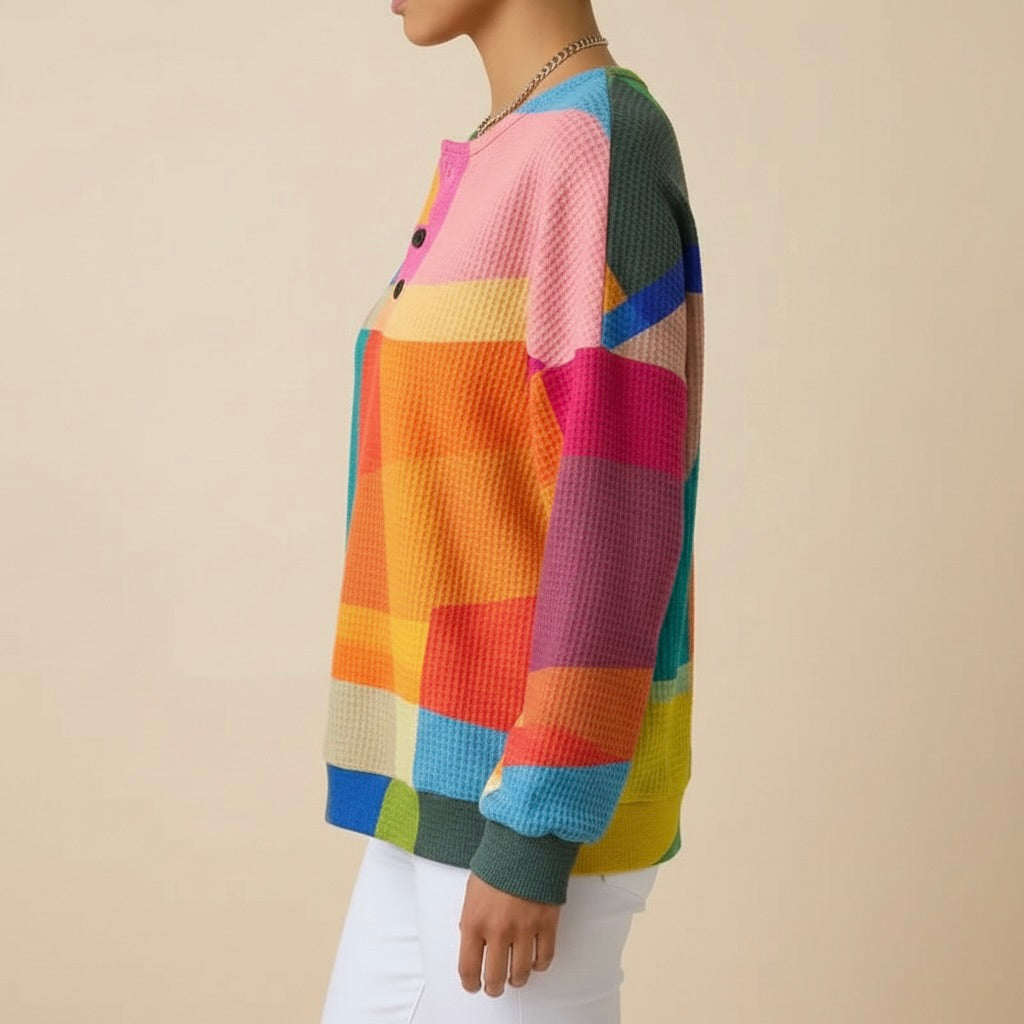 The Colorful Vintage Patchwork Sweatshirt combines retro charm with modern comfort. Designed with a vibrant printed pattern and decorative buttons at the neckline, this sweatshirt instantly elevates your casual wardrobe.